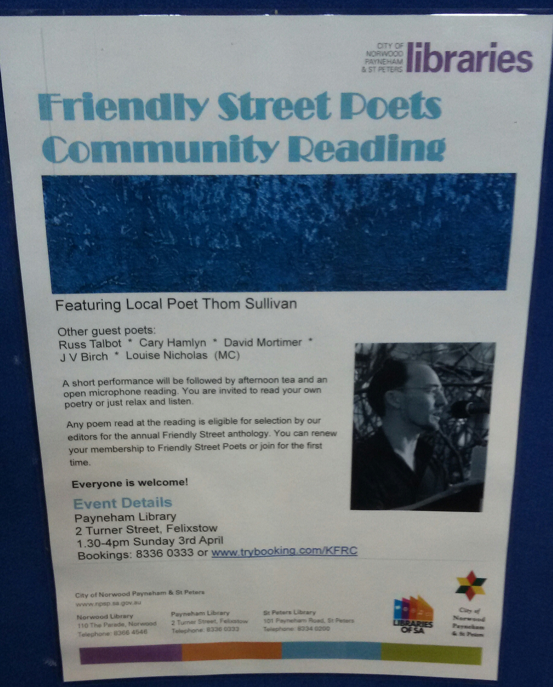 I was one of five guest poets invited to read at Payneham Library yesterday as part of the Friendly Street Poet readings and it was a fab line-up – with Thom Sullivan headlining backed up by Cary Hamyln, David Mortimer, me and Russ Talbot, all introduced by the charming Louise Nicholas.