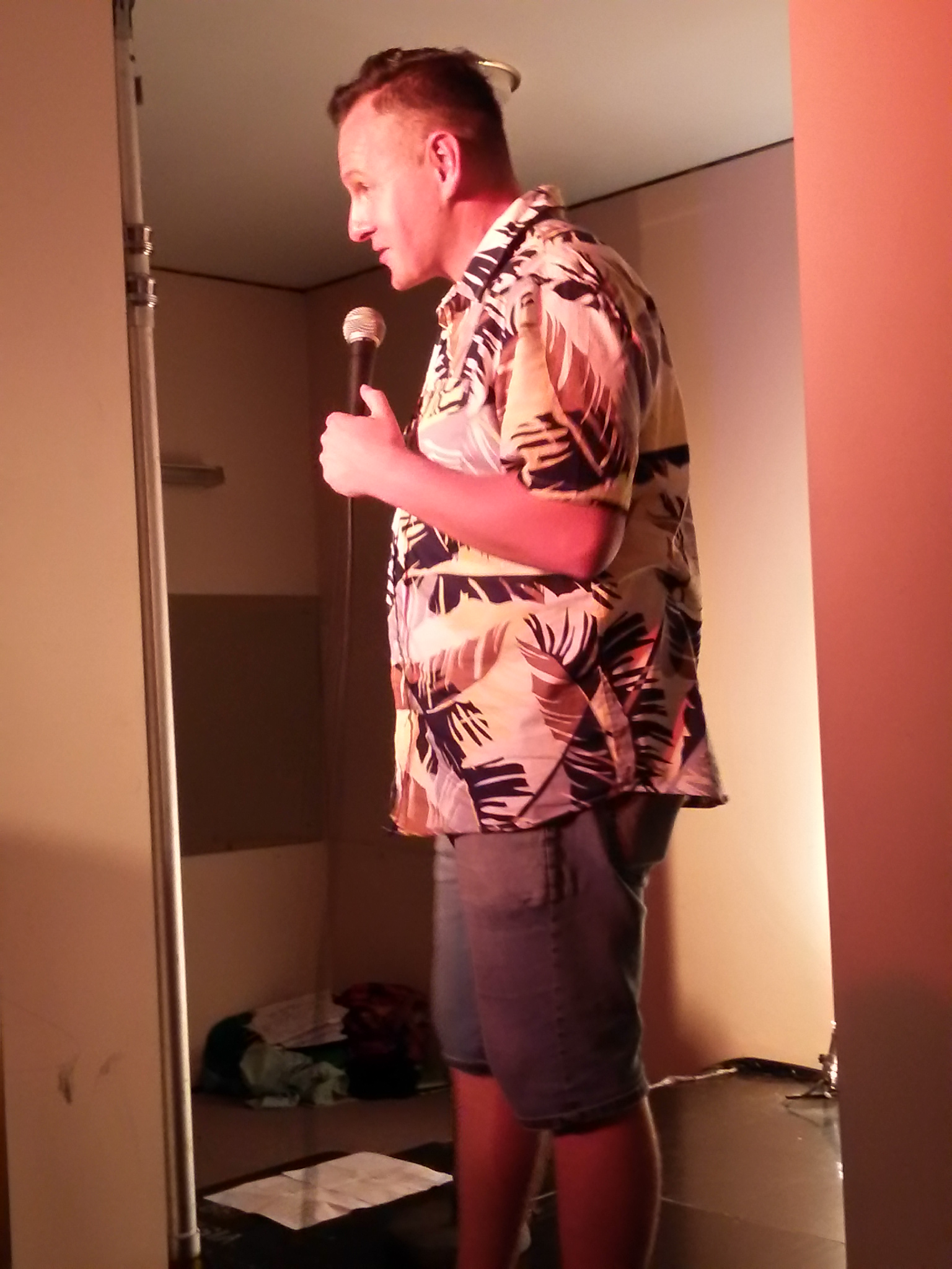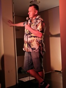 Mickey talks about ice, how he got tired of it when he found himself doing a tour of someone else’s home and confronting a “sharkie” in an On the Run at two in the morning (buying cheese Twisties for his daughter’s lunch) who asks him what the fuck you looking at? to which Mickey tells us, now I love a quiz. And then we hear the best heckle ever. Mickey explains how he went to the Middle East to gig for the troops there when an audience member mutters haven’t they been through enough?! A brilliant come back, flooring us all, including Mickey!