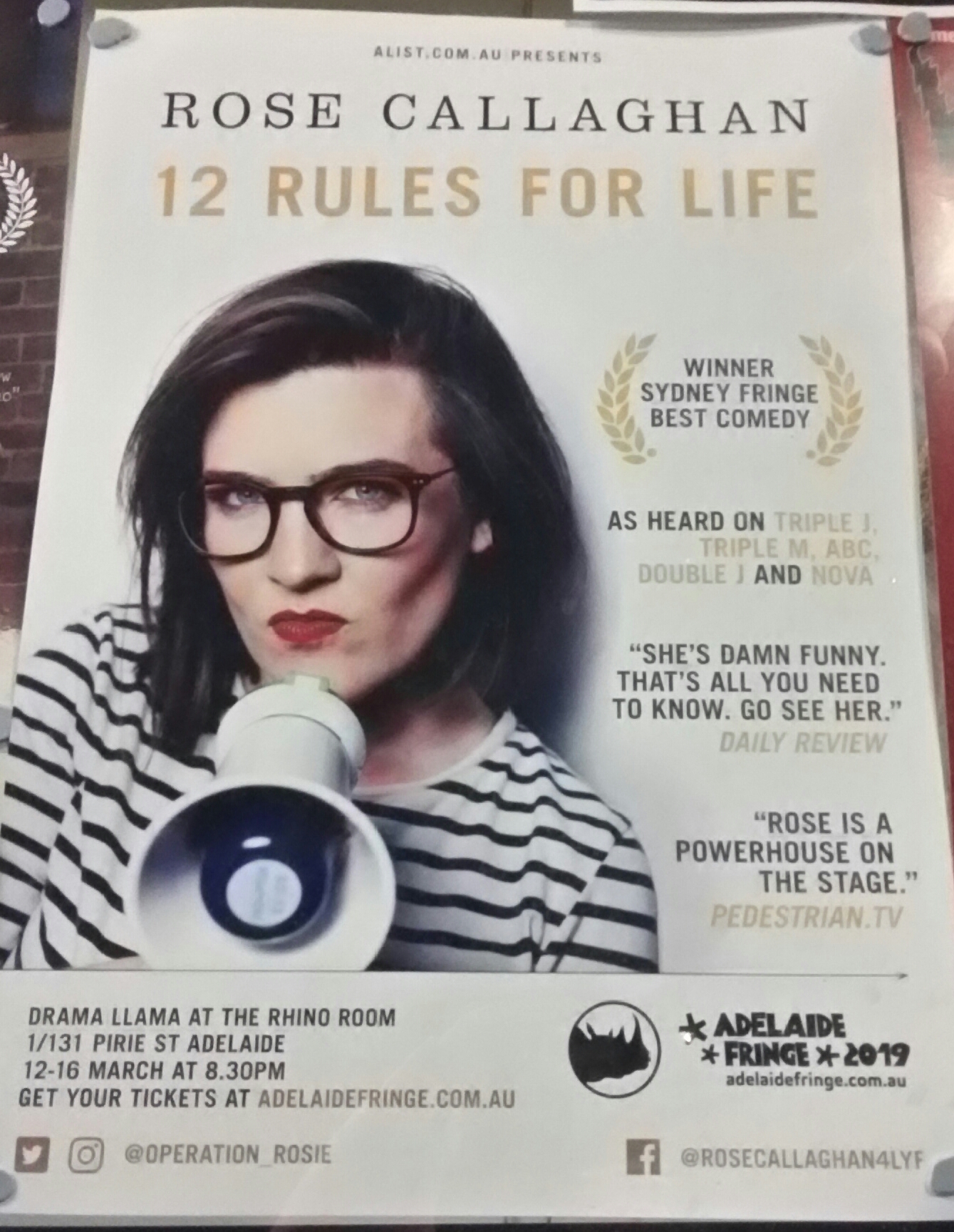 My fourth mental-health themed show to review for mindshare was Rose Callaghan’s 12 Rules for Life performed at the Rhino Rooms last night.